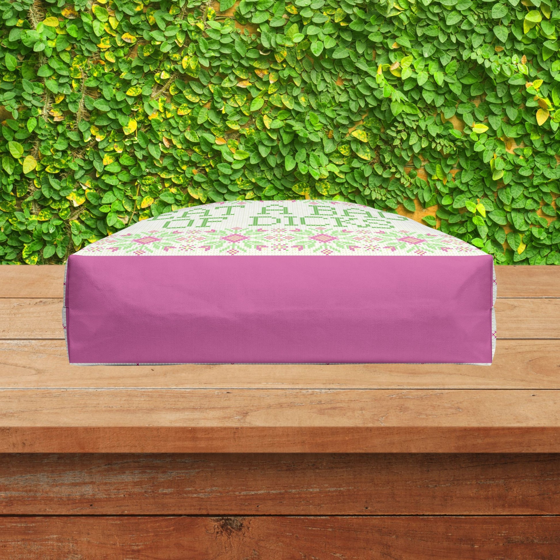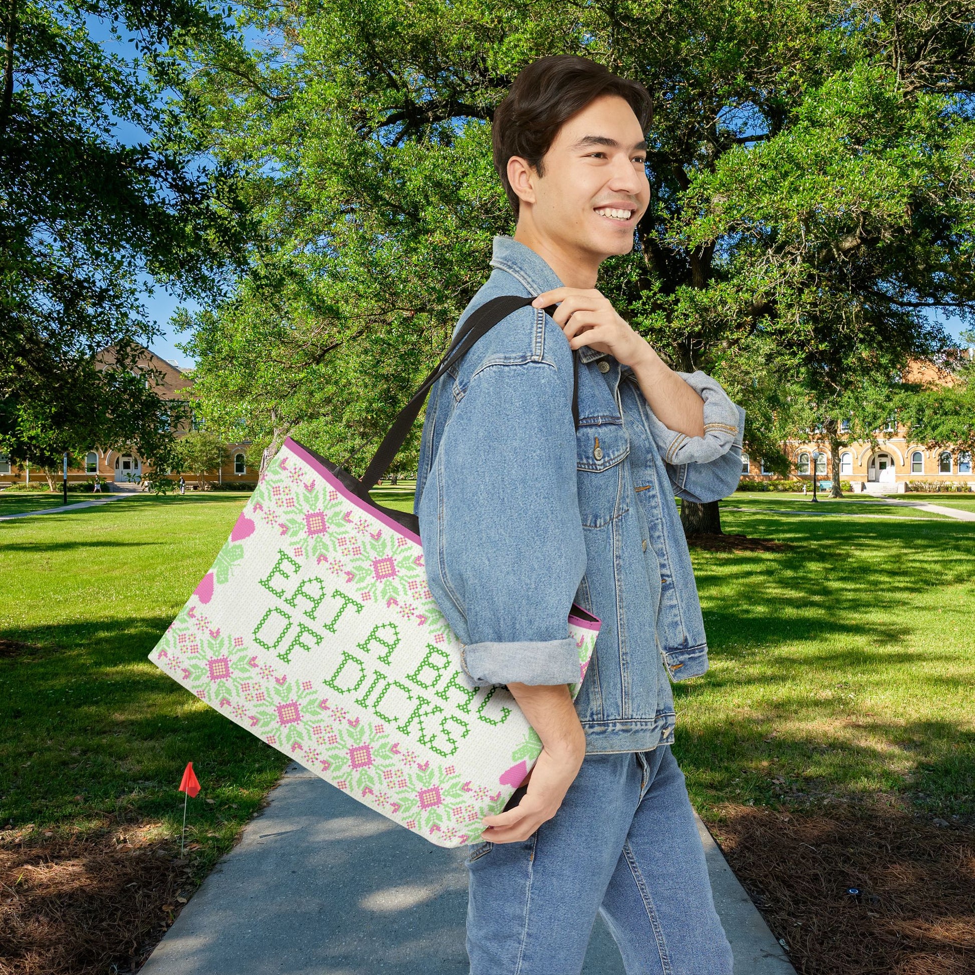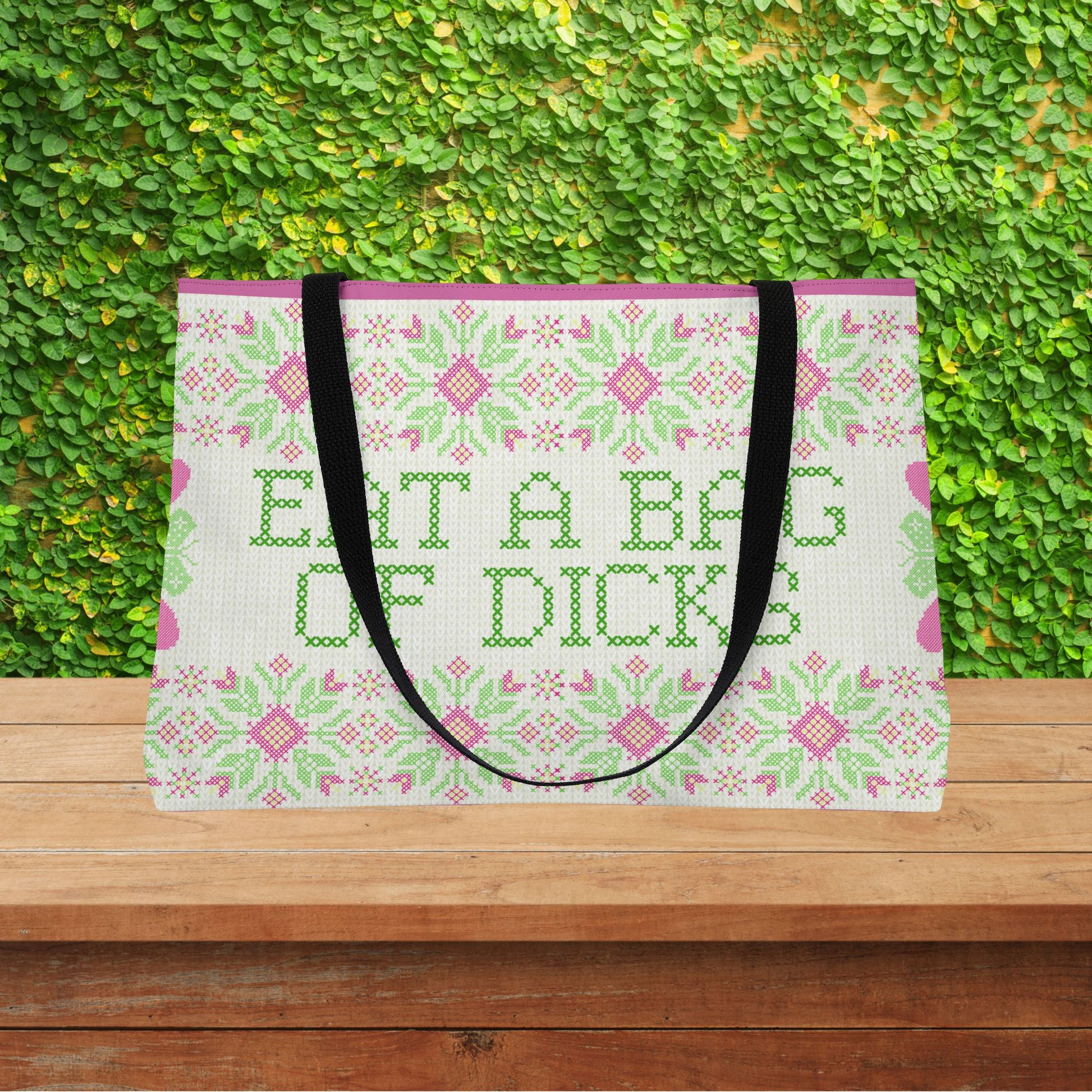 This funny Eat a Bag of Dicks cross stitch look XL Tote is perfect for those with a unique sense of humor.
