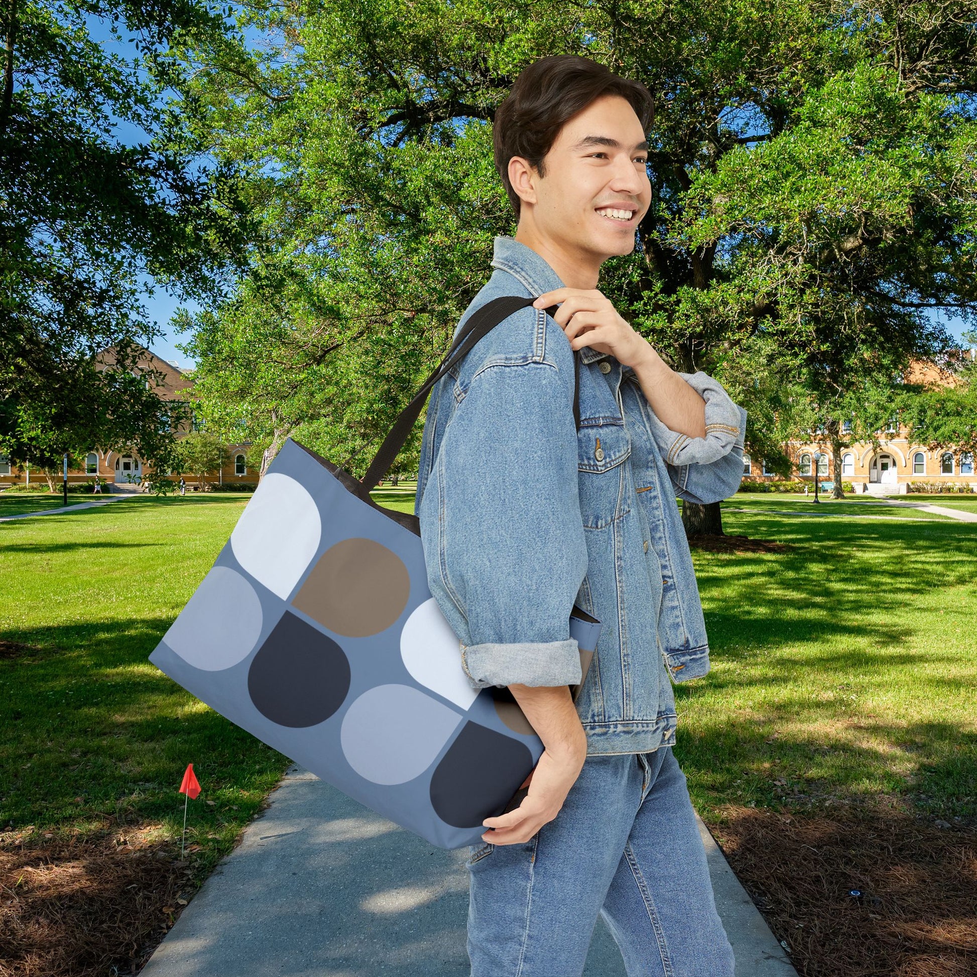 Clean lines, cool tones, and a confident silhouette—the Geo 2 XL Tote delivers modern design in a practical oversized format. With a retro-geometric pattern in sage, slate, and navy, this tote is built for everything from gym runs to weekend getaways.