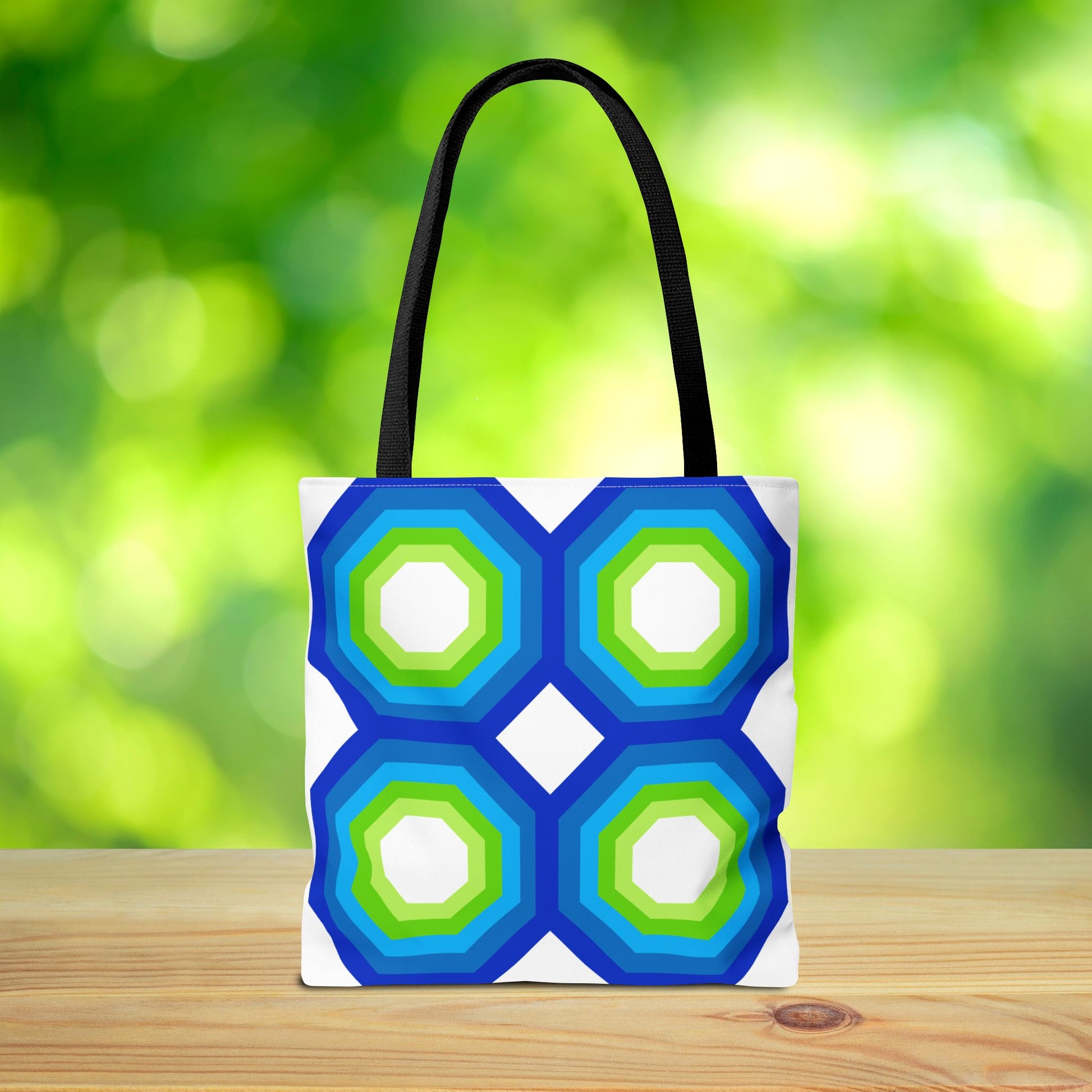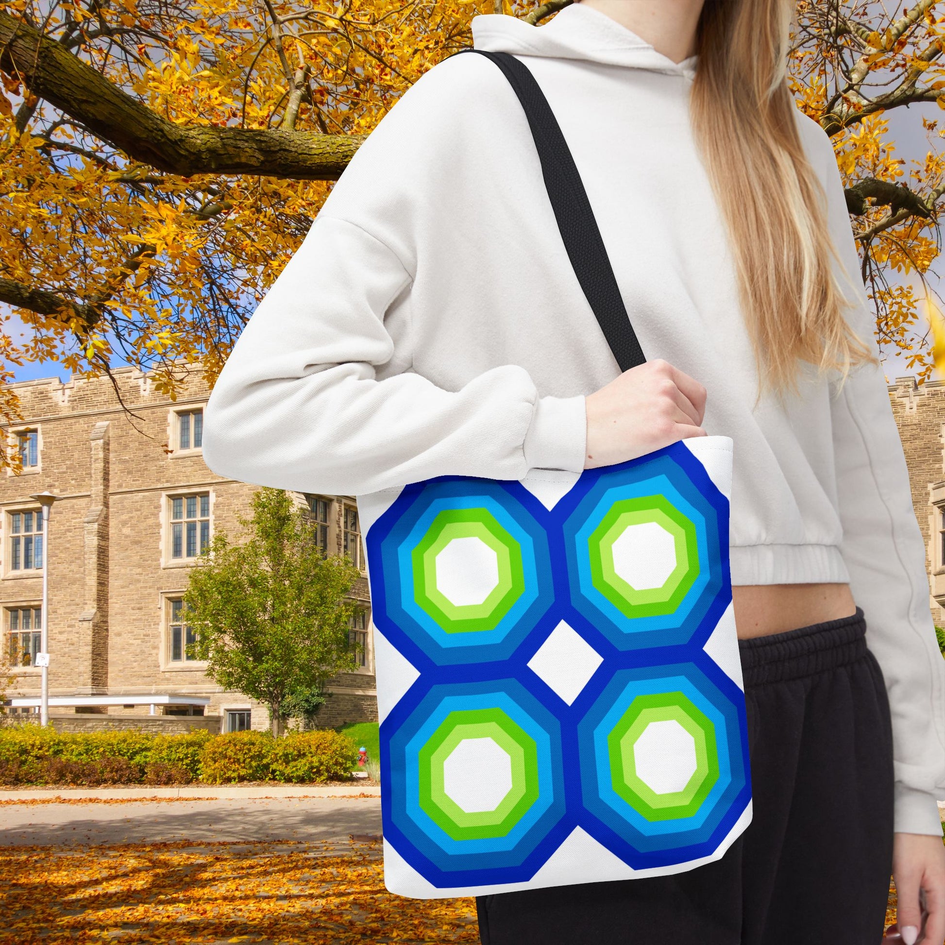 The Geometric Art XIV Tote features a striking pattern of layered octagons in vibrant shades of blue and green. It’s the perfect accessory for art lovers, creatives, and anyone who wants to carry a little personality with them wherever they go.