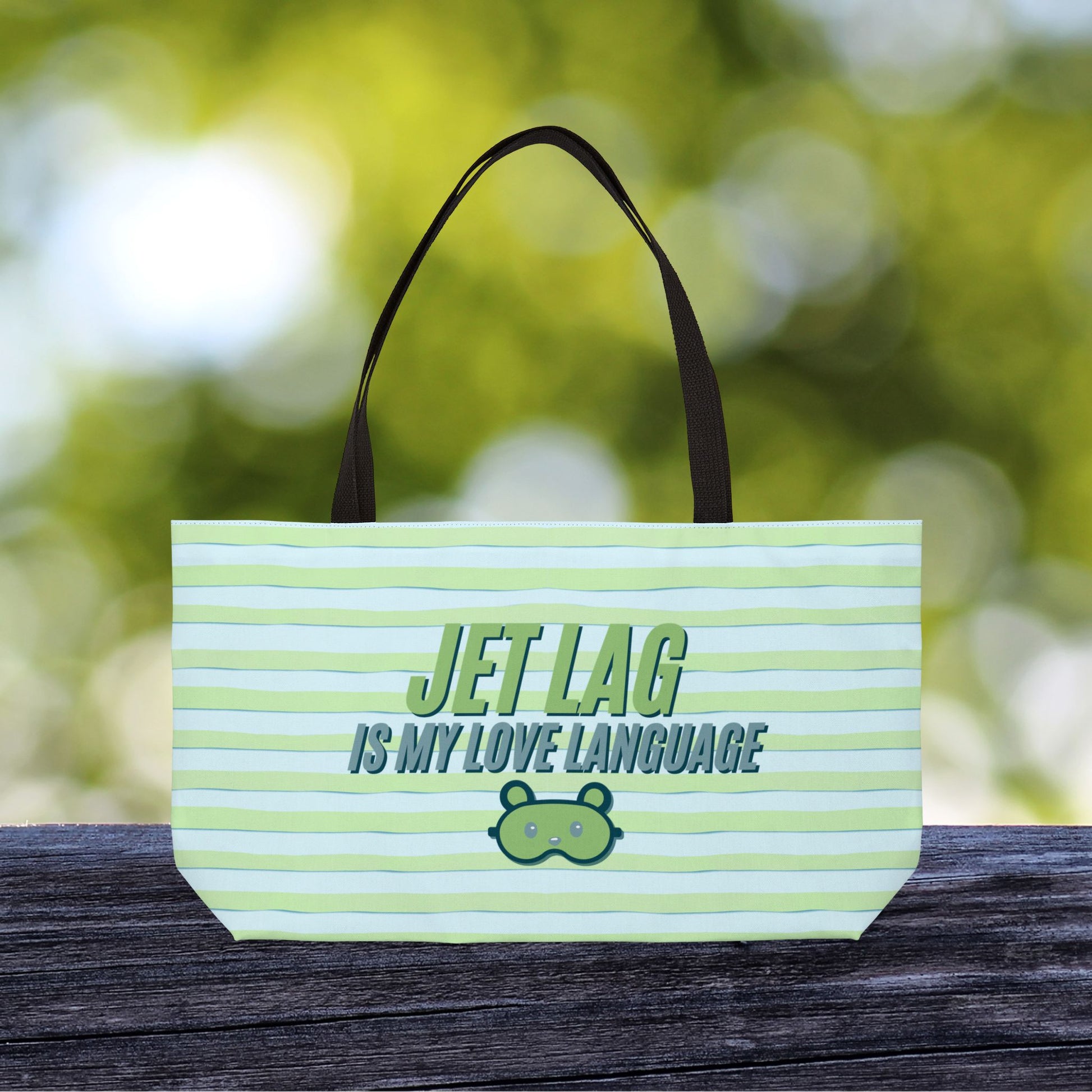 Jet Lag Is My Love Language – XL Tote Bag in Green & Blue | For the Traveler Who’s Always Tired but Loving It