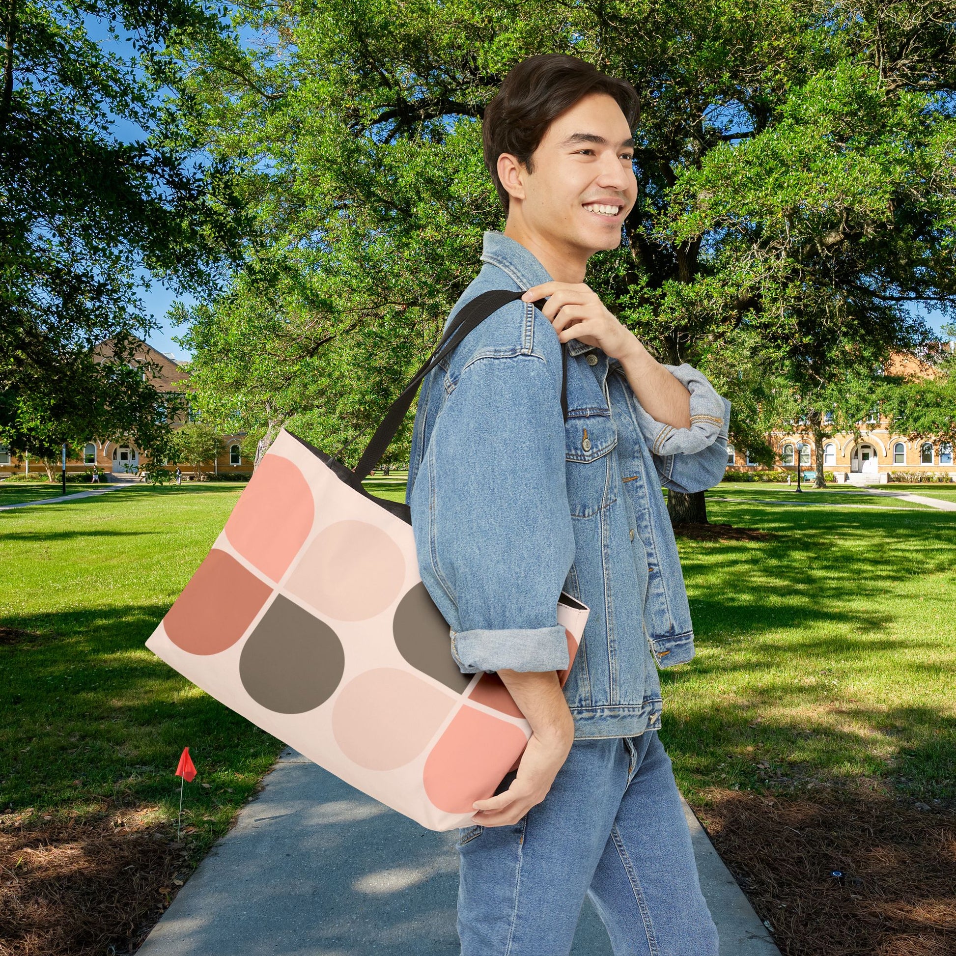 The Mod-Boho Clover XL Tote blends mid-century modern style with earthy boho charm. Featuring a geometric petal pattern in warm muted tones, this oversized tote is a statement piece that carries it all—whether you're headed to the market, the beach, or a weekend away.